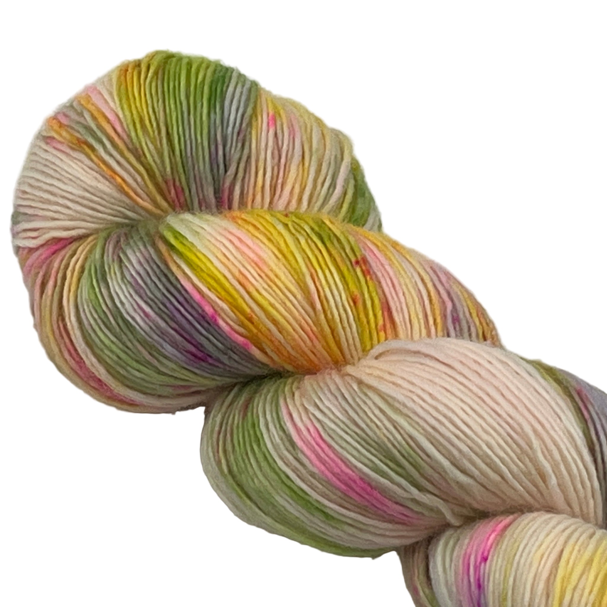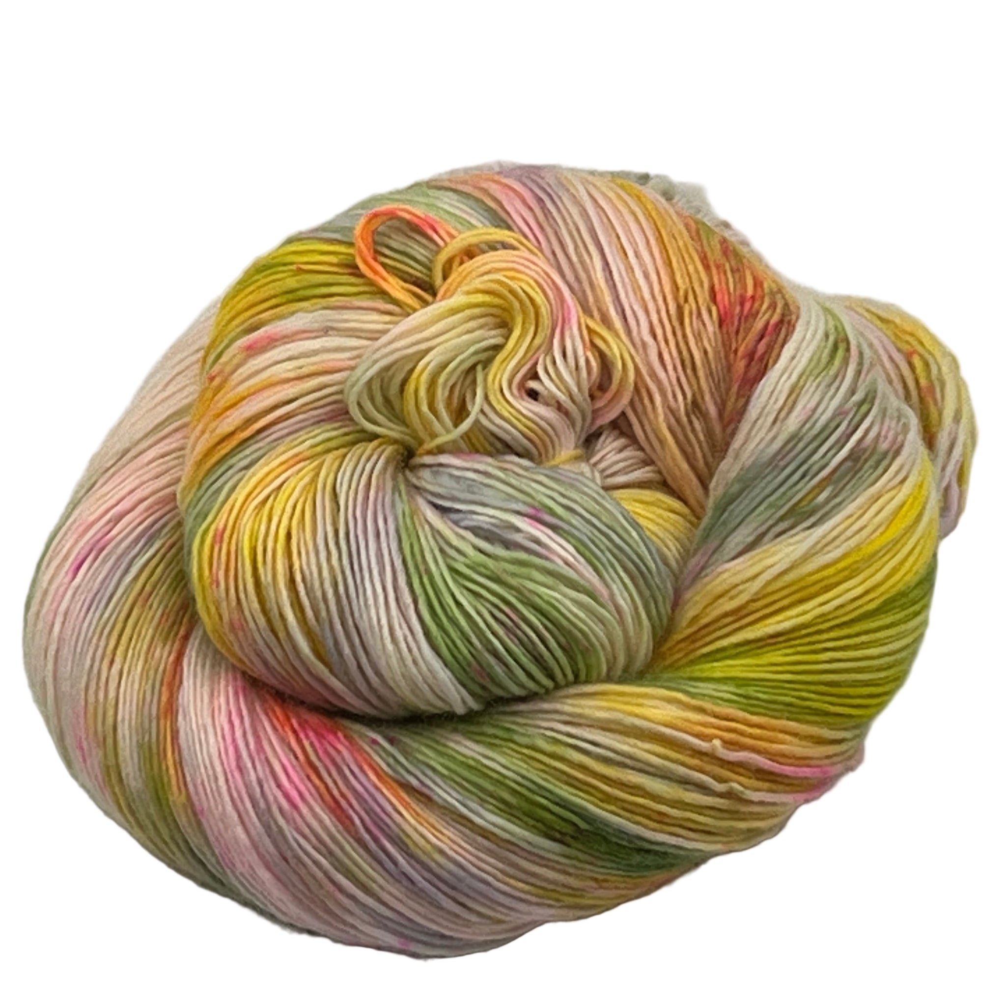 Wild summery colors including neon pink, a sunny yellow, green apple, a touch of citrus and the tiniest hint of lilac. This yarn is named after our kitten, Helena, who has absconded with this particular skein at least twice.